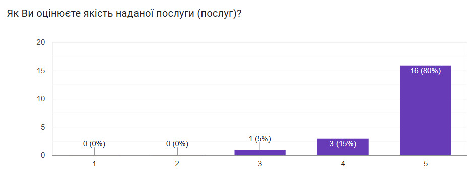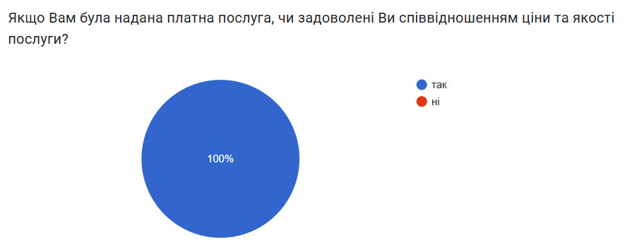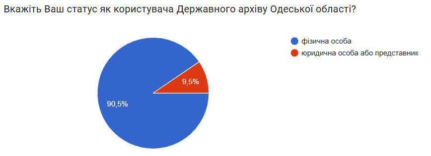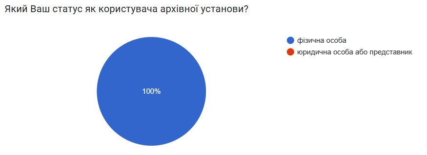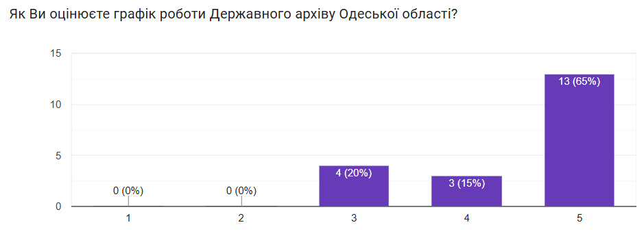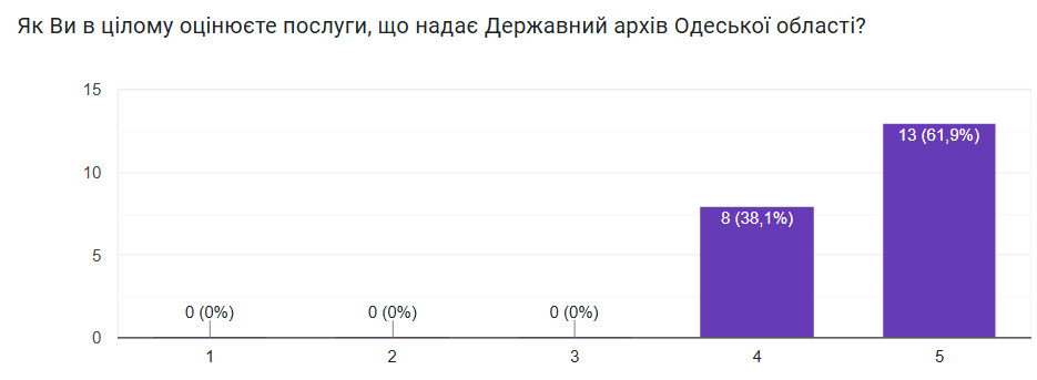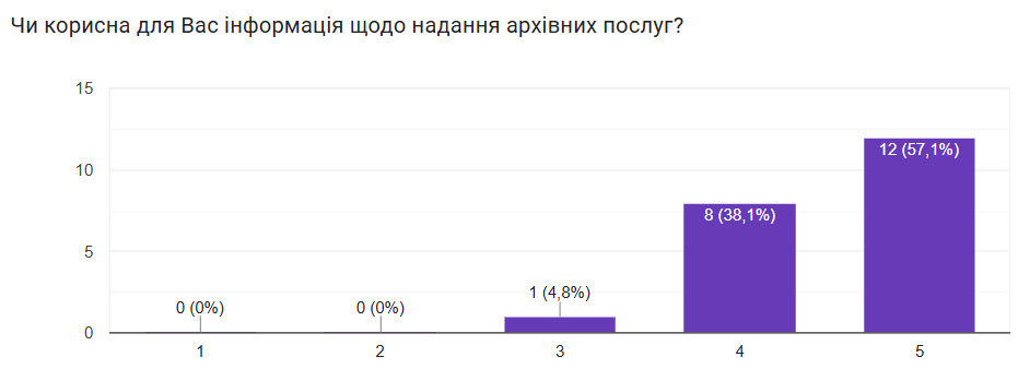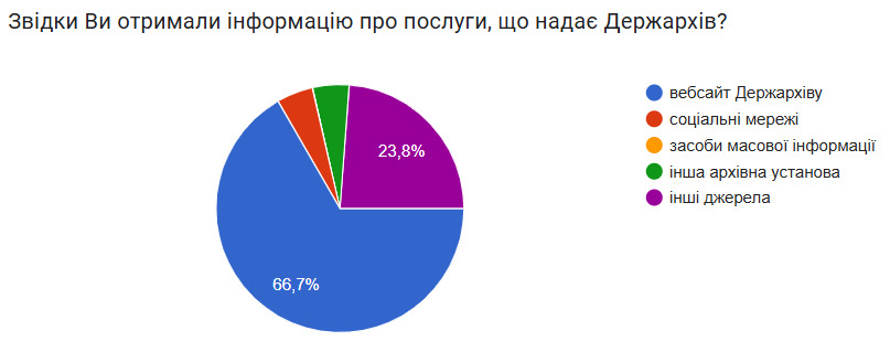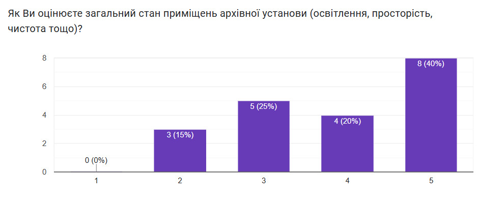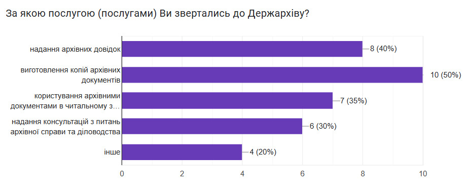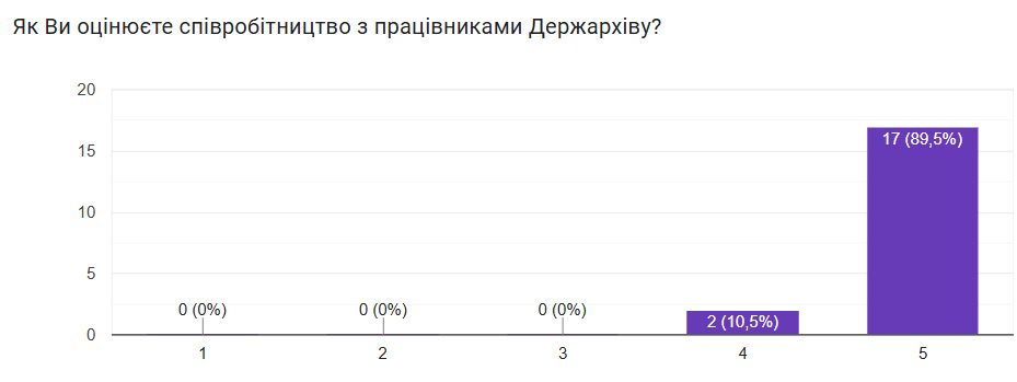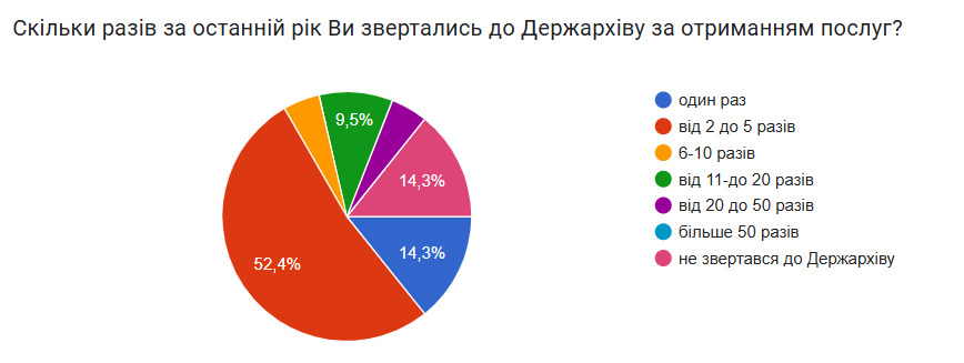 Проведене опитування дозволило окреслити реальний досвід та очікування користувачів. Більшість респондентів позитивно оцінили рівень повноти отриманих відповідей, дотримання строків виконання послуг та професіоналізм співробітників. Зокрема, оцінка послуг, що надає Держархів становить 4,5 бали з 5. Найбільш частіше до архіву звертались за послугами надання архівних довідок (40% респондентів) та виготовлення копій архівних документів (50% респондентів). Культура спілкування та ставлення до користувачів з боку співробітників архіву оцінена респондентами у 4,5 бали з 5.
