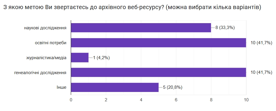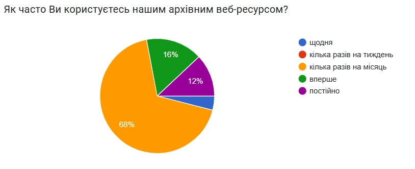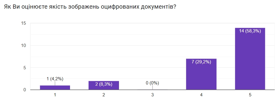 Щодо роботи цифрових сервісів архіву: користувачі висловили вдячність за якість оцифрованих документів та зрозумілість інформації на вебсайті (82% респондентів). Якість зображень оцифрованих документів оцінена у 4,3 бали з 5. Разом із тим прозвучали й зауваження щодо потреби в подальшому розширенні онлайн-доступу до документів та вдосконаленні процесу виготовлення копій архівних справ.